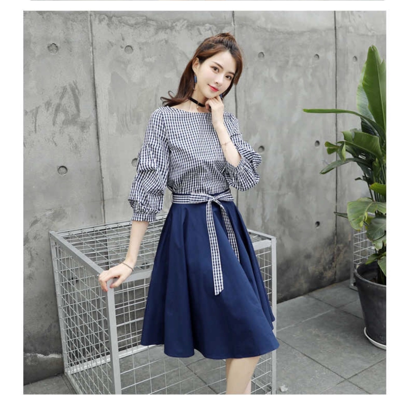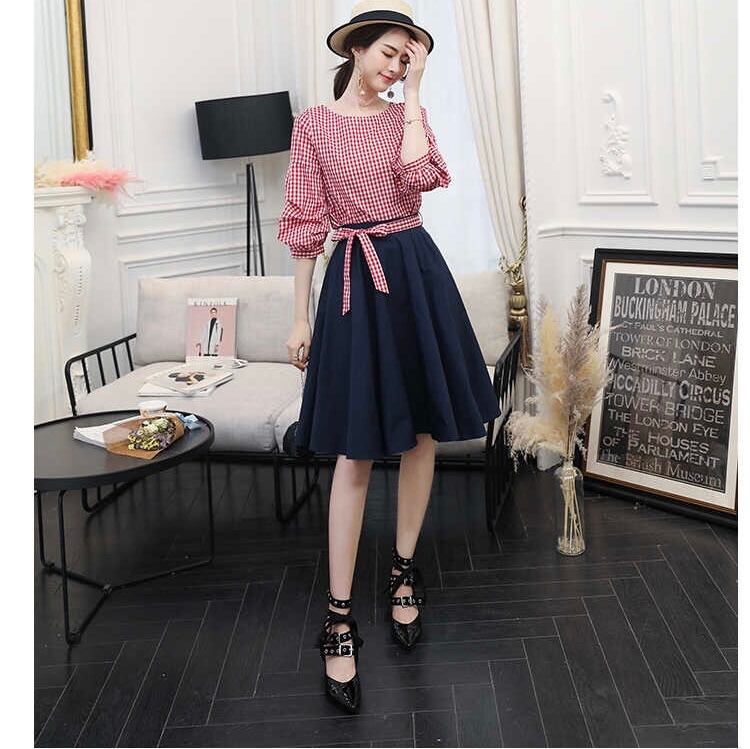 大人気のギンガムチェックシャツ ネイビーフレアスカート 2点セット