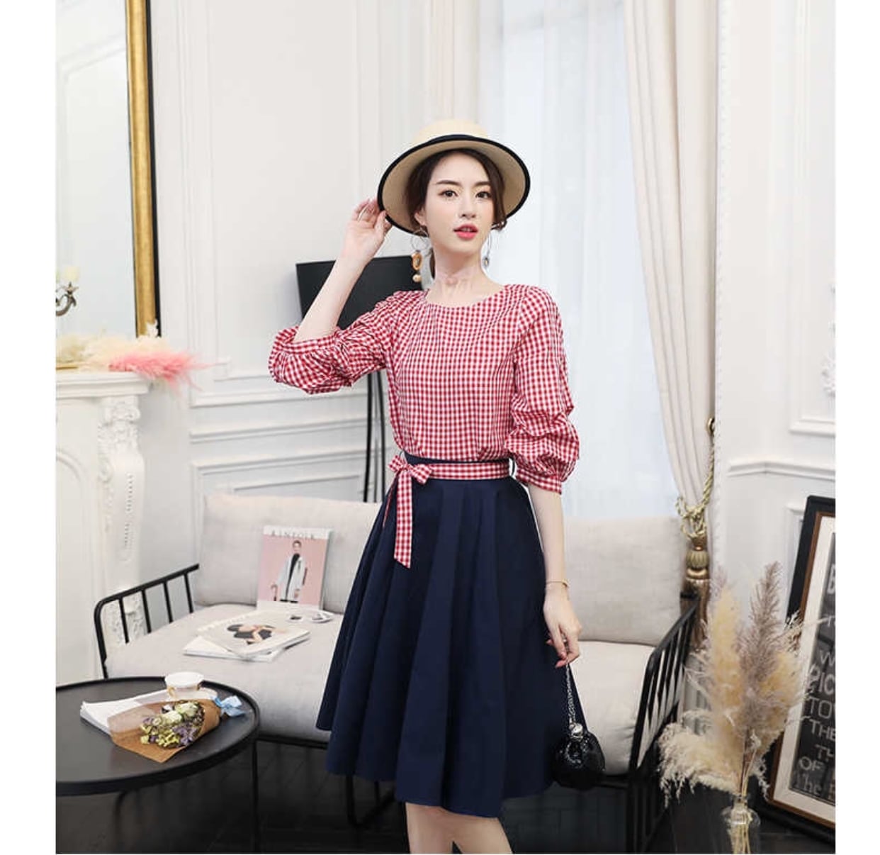 スリーブにボリュームのある女の子らしい着こなしができるギンガムチェックシャツ。ベルトで締めてスタイリッシュな演出をしていますね。