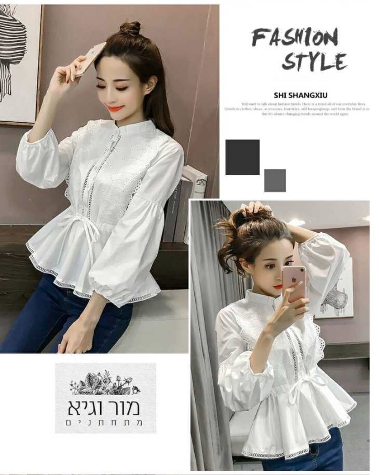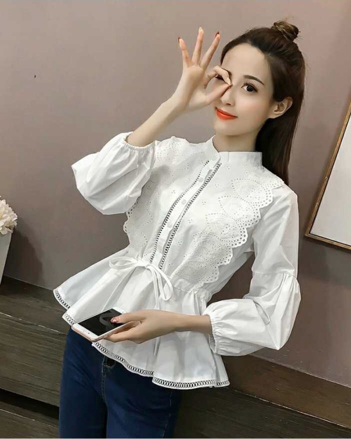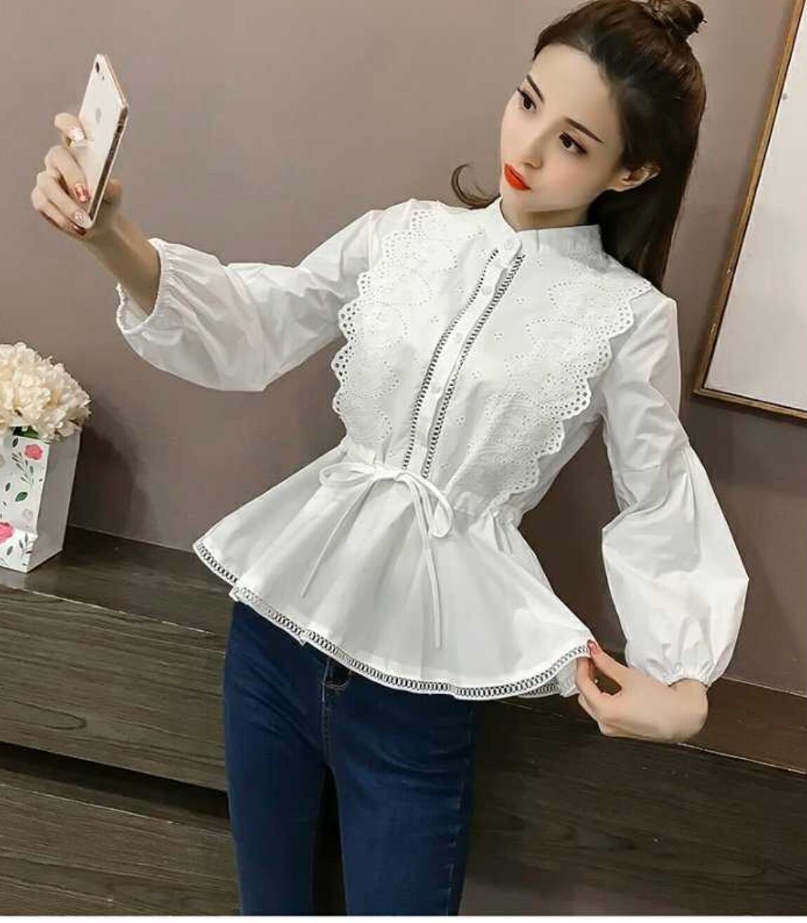 ストライプシャツ/ブラウス/ 韓国ファッション / レース飾り デザイン袖 ストライプのシャツ