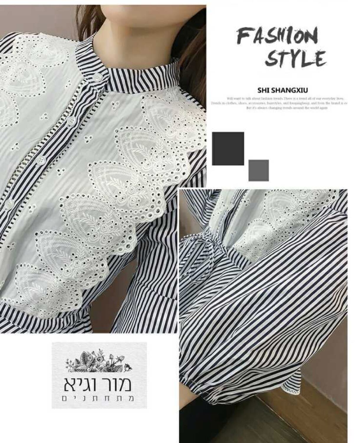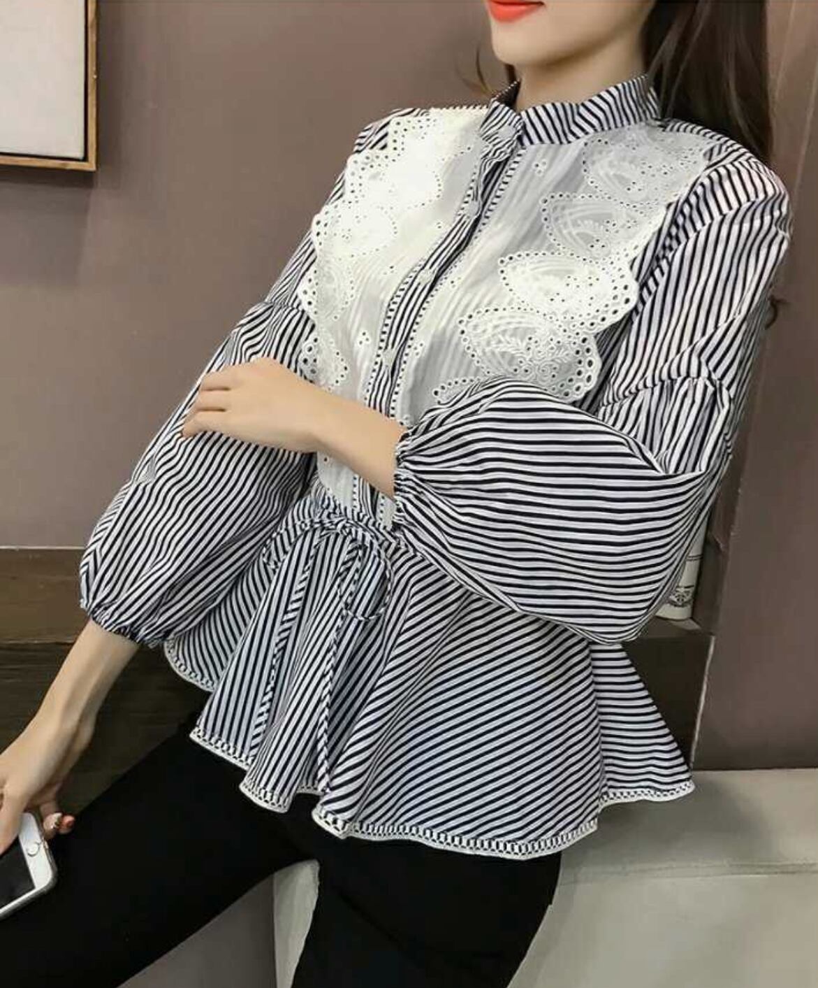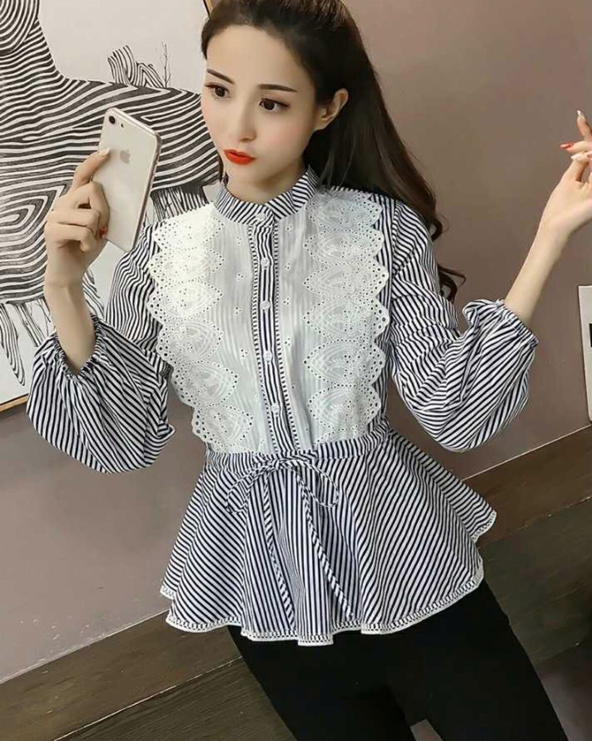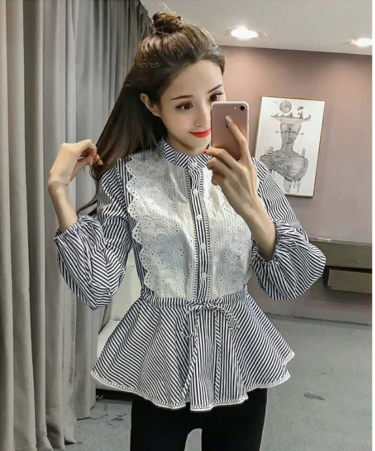 ストライプシャツ/ブラウス/ 韓国ファッション / レース飾り・ストライプのシャツ